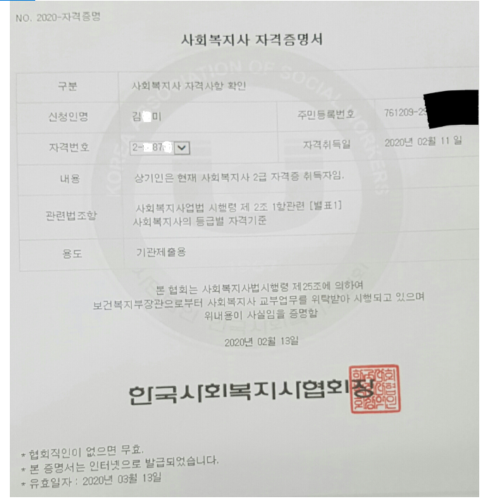 첨부한사진은 후기를 작성해주신분이 취득한 사회복지사 자격증 조회입니다!