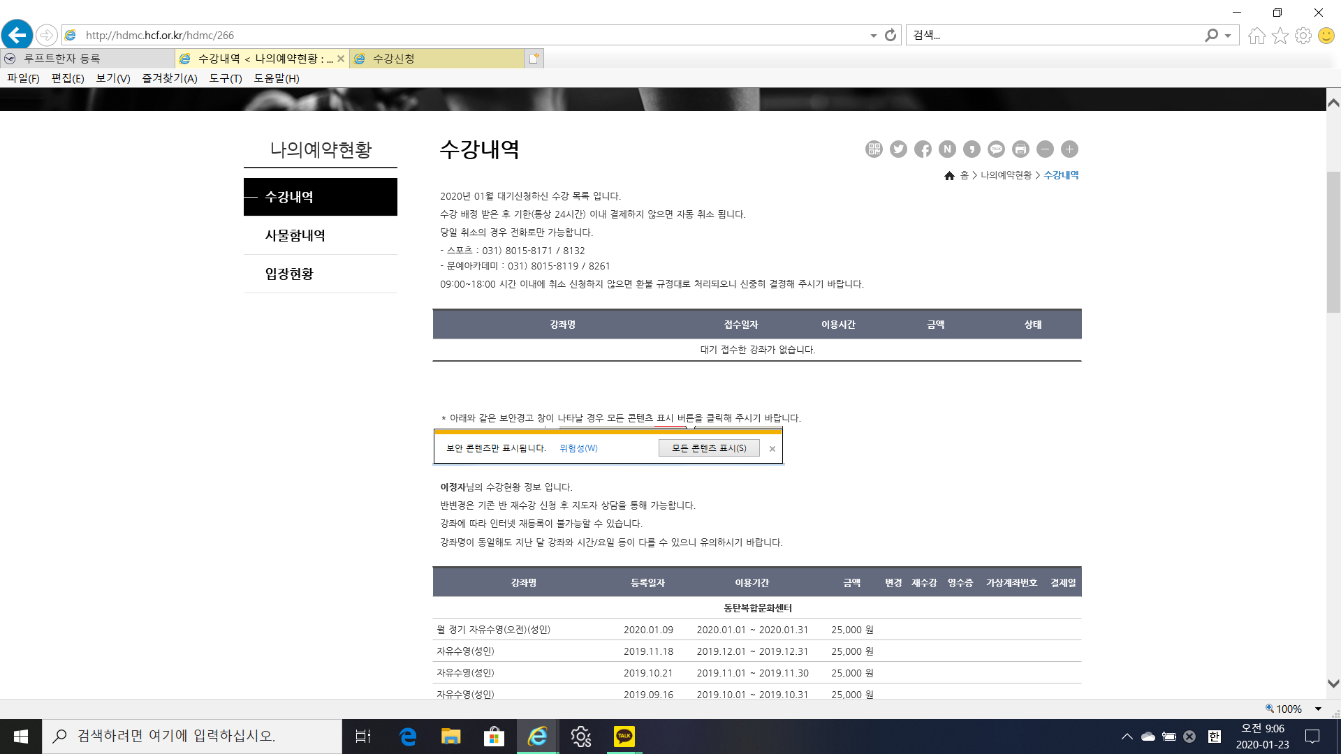 안녕하세요, 이번에 자유수영을 수강신청하고자 하는 사람입니다. 다름 아니라 방금 전에 자유수영 오전반을 수강신청하는 버튼을 눌렀더니, "이미 등록하신 강좌"라면서 수강신청을 하지 못하게 되었습니다. 하지만 나의 예약현왕에 들어가 보면 "대기 접수한 강좌"가 없다고 떠 있습니다. 이럴 때는 수강신청을 어떻게 해야 하나요?