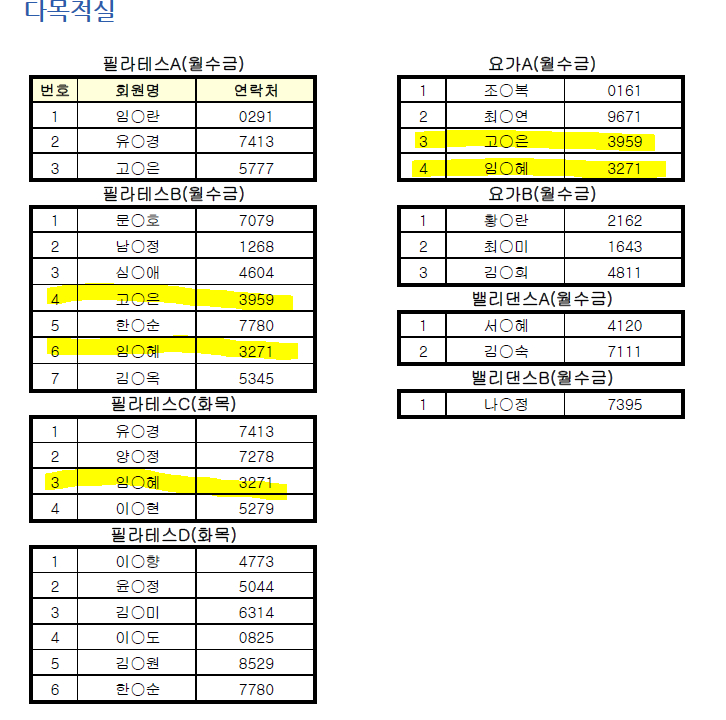 안녕하세요. 이번 신규당첨자 목록을 보고 이상한점이 있어서 문의 드리는데요. 세명이 각각 세 반/ 두 반에 중복으로 당첨되어있는걸로 보이는데 이게 가능한건가요. 저는 필라테스 교실에 신청했다가 당첨 탈락되었는데, 제가 신규신청 할때 홈페이지 수강신청 페이지에선 한군데 접수밖에 못한다고 뜨던데요. 또한 수강지원 시 종목별 1인 1강좌만 지원이 가능하다고 알고있습니다. 어떻게 세사람이 각각 세군데/두군데 중복 당첨이 되어있는지 궁금하네요. (캡쳐파일 예; 임O혜 필라테스 B,C 요가 A / 고O은 필라테스B,요가A / 유O경 필라테스 A,C) 시스템 오류인건지, 원래 일반적으로 중복접수/신청이 가능한건지... 종목별 1인 1강좌만 지원이 가능한걸로 알고있는데, 제 입장에서는 당첨결과가 불공정하다는 생각이 드네요. 확인/설명 부탁드립니다. 파일 첨부합니다.