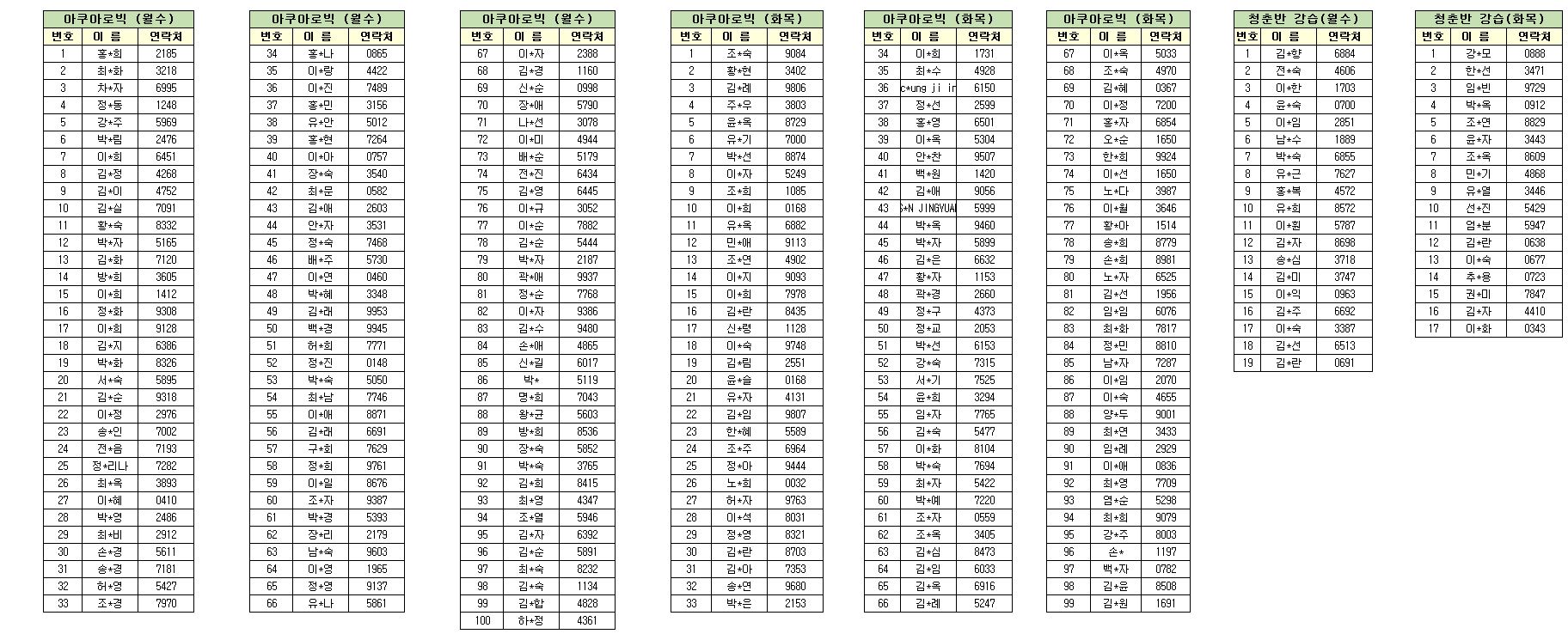 2024년 10월 14일 18시 기준 수영 프로그램 대기자 현황입니다. 대기자 중 2024년 11월 강습 순번도래자 및 등록날짜, 결제방법 등의 자세한 사항은 10월 20일부터 정보마당 → 공지사항을 통해 안내해드리오니 확인 부탁드립니다.